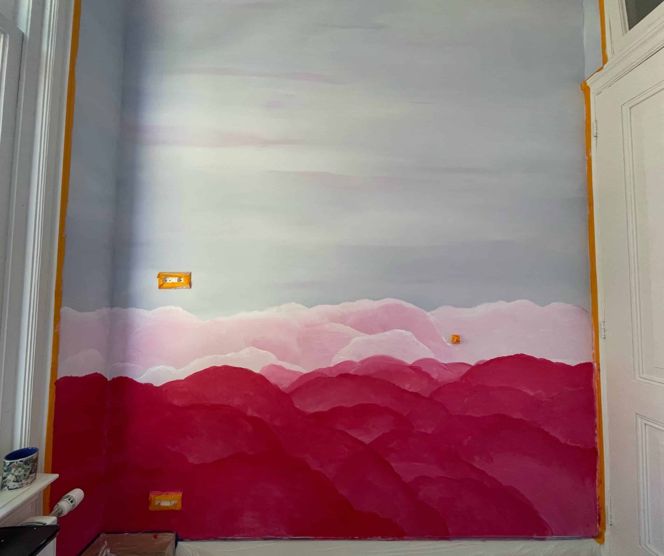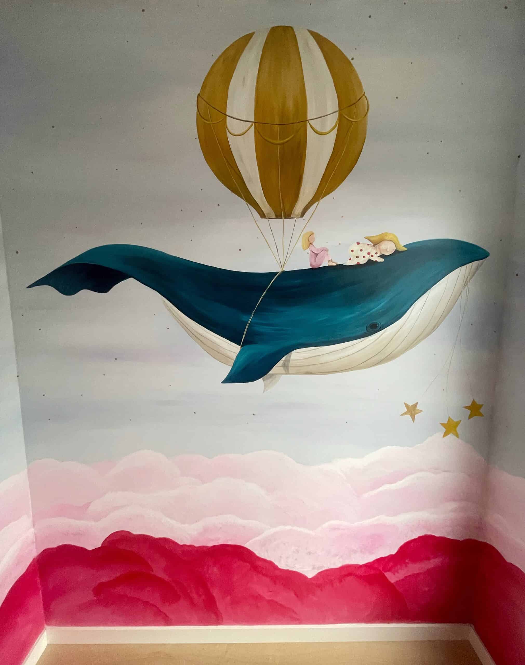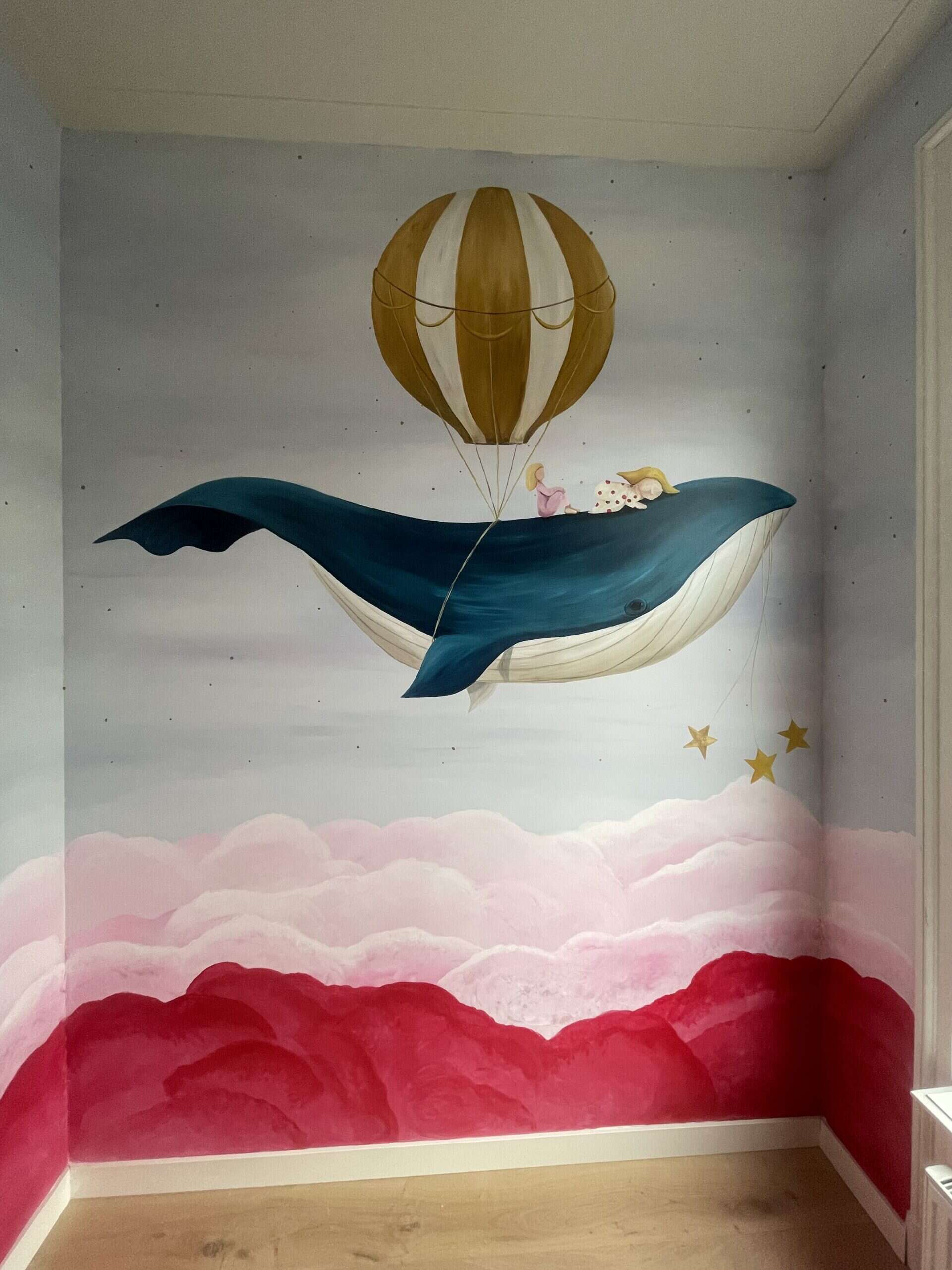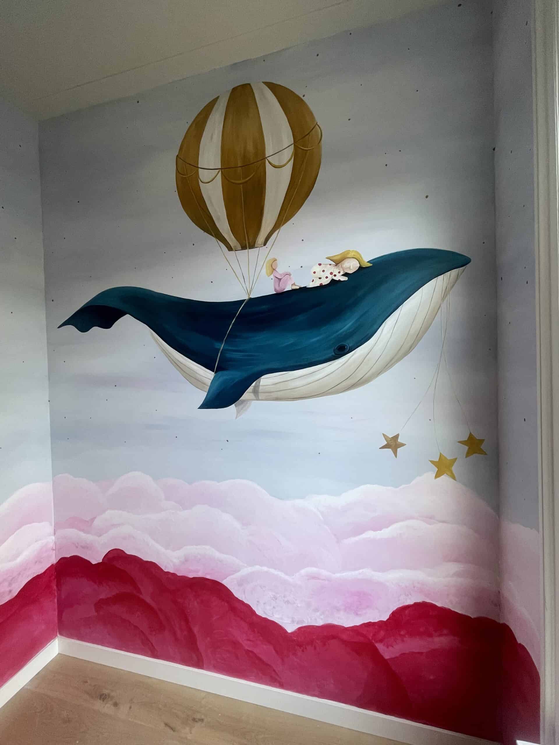 Een mooie hoge kinderkamer in een karakteristieke woning in Groningen. Van een witte muur naar een kleurrijke, dromerige muurschildering, waarin persoonlijke details zijn verwerkt die van betekenis zijn voor de opdrachtgever. Ik werd erg vrolijk van het maken van deze schildering. En de contrasterende kleuren van de blauwgroene walvis met de roze wolken versterken elkaar zo mooi. Heel gaaf als een klant met zo’n mooi idee komt.